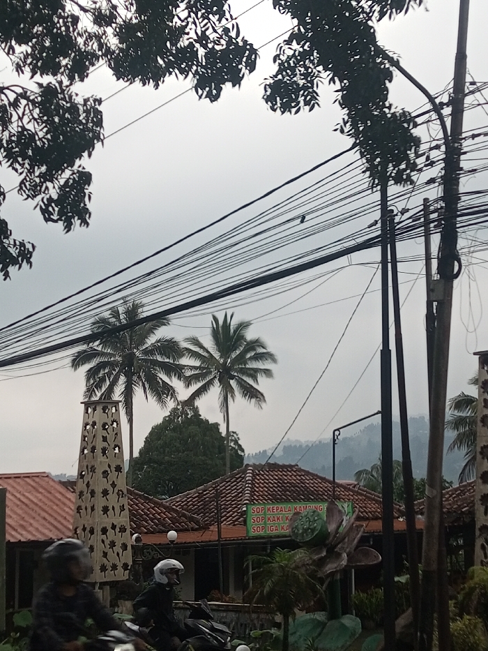 The image displays a cloudy day scene with palm trees and dense overhead power lines. A building with a red tiled roof and a sign that says "SOP KEPALA KAMPING SOP KAKI K SOP IGA KA" is visible. A decorative tower stands next to the building. Two people on motorbikes are riding in the foreground. Lush green foliage frames the scene, obscuring some of the view. Distant hills are visible through the haze.