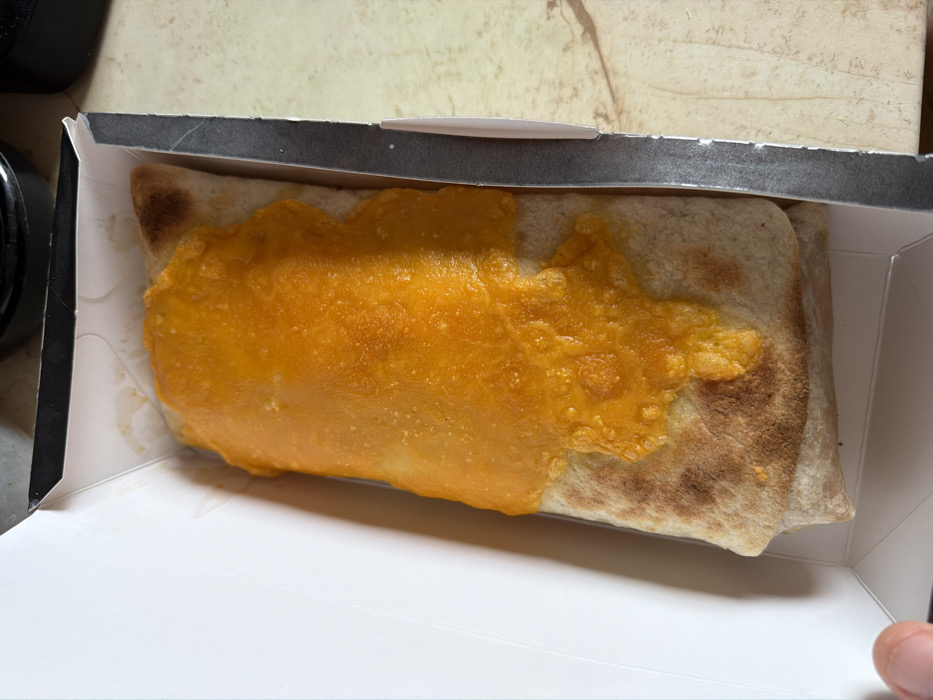 - "A single, elongated food item, resembling a burrito or wrap, is presented horizontally within an open, white cardboard take-out box featuring black trim" by FM-U8vBE2, licensed under CC BY 4.0