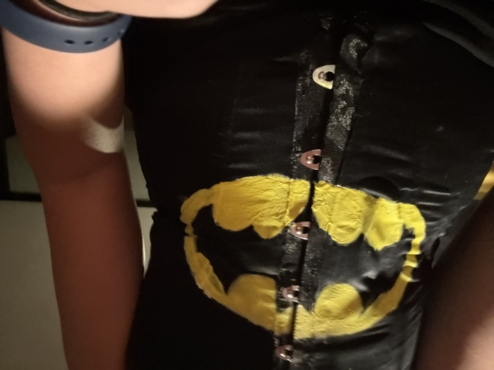 The image depicts a close-up of a person's upper torso and left arm, situated in an indoor environment within Naucalpan de Juárez, Mexico. The subject is attired in a black, form-fitting garment, resembling a corset, featuring a yellow Batman logo centrally positioned on the torso. The yellow paint of the logo appears textured and somewhat irregular. A vertical row of five visible metallic, silver-colored fasteners secures the front of the garment. The subject's bare left arm is present on the right side of the frame, with a dark blue wristband, perforated along its visible length, encircling the wrist. The background is indistinct, indicating an interior space illuminated by ambient lighting.