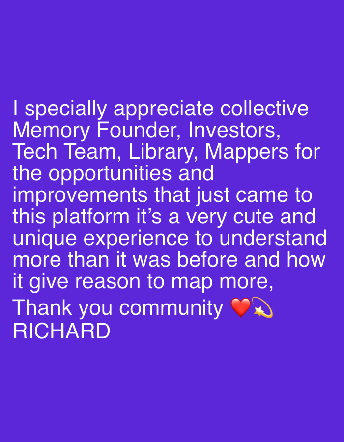 Purple background with white text that expresses appreciation for "Memory Founder, Investors, Tech Team, Library, Mappers" for improvements to the platform. The text states the platform is "a very cute and unique experience" that encourages further mapping. The message ends with "Thank you community ❤️💫" and the name "RICHARD".