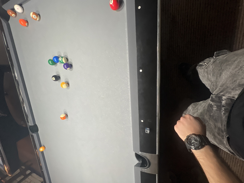 The image displays a grey-felted billiard table, viewed from a first-person, downward perspective
