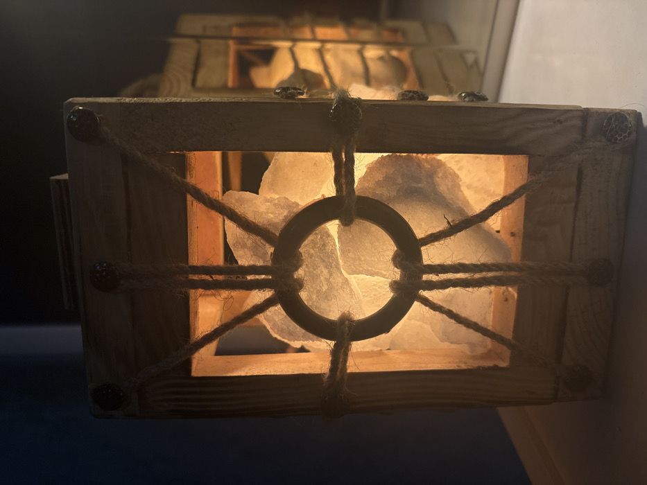 A handcrafted wooden lantern, approximately rectangular in shape, is depicted in a dimly lit indoor setting. The lantern features a light-colored wooden frame adorned with jute rope, forming a web-like pattern around a central dark metallic ring on its front face. Decorative metallic studs are embedded at the corners of the wooden frame. Inside the lantern, multiple irregular chunks of translucent, light-colored material, resembling Himalayan salt crystals, are internally illuminated, emitting a warm orange-yellow glow. The lantern rests on a reflective, light-colored surface, which shows a blurred reflection or another identical lantern in the background to the right. No individuals, specific actions, or interactions are visible. The image does not contain any discernible elements or identifiers to specify its location within the city of Tbilisi, Georgia, or any other geographic location.
