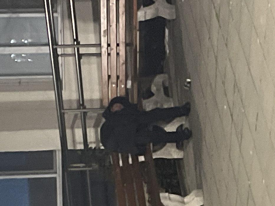 A lone individual is depicted slumped forward on a wooden park bench in an outdoor paved area in Burgas, Bulgaria
