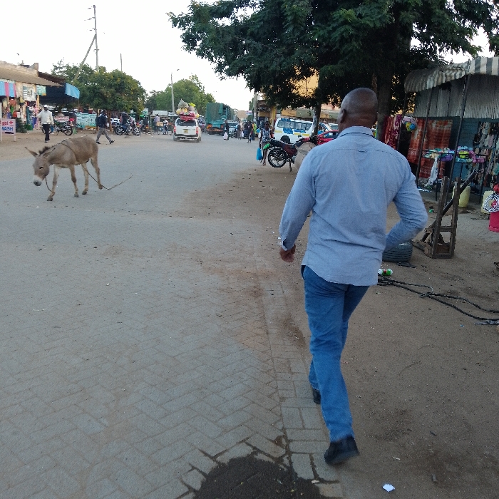 The image depicts a street scene in Wote, Kenya, characterized by mixed pavement and dirt surfaces. In the foreground, a male subject, dressed in a light blue long-sleeved shirt and blue jeans, is observed from behind, walking away from the camera towards the center of the street. His right arm is slightly bent, and his left arm is straighter, both hands out of view. He wears dark shoes. To the left of the frame, a light brown donkey with a rope loosely draped around its neck and trailing to the ground stands on the paved section of the road, facing generally right but with its head turned slightly left. Its front left leg is slightly lifted. The background reveals a bustling urban environment. On the left side of the street, multiple single-story buildings house shops or stalls with colorful awnings and merchandise displayed. Several individuals are visible walking near these structures. A white vehicle, possibly a car, is parked further down the street, and behind it, a green truck can be seen. Various motorcycles are also present on both sides of the road. On the right side of the frame, near the man, there is a dirt shoulder with market stalls constructed from wood and corrugated metal, displaying items. A large green-leafed tree partially obstructs the view of structures on the right. Utility poles and overhead lines are visible in the distance. The lighting suggests daylight, possibly late afternoon, with soft shadows. Debris, including a dark puddle-like stain and white scraps of paper, are visible on the paved ground in the lower right foreground.