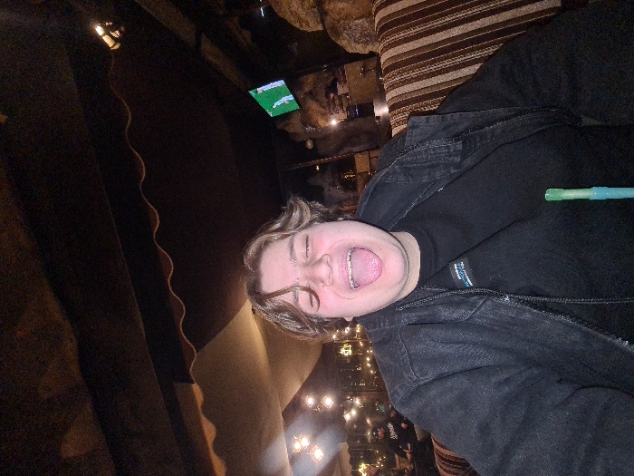 A person lies on a striped sofa, head close to the camera, mouth open with tongue extended. They wear a dark denim jacket over a black top. A teal object is visible near their jacket. In the blurred background, lights suggest an interior setting with other people present. A TV screen is also visible in the distance, showing a green image. The image has a somewhat dark, low-lighting ambience.