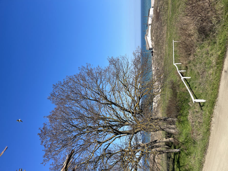The image depicts a coastal landscape in Lozenets, Bulgaria, observed under a clear blue sky. A large, deciduous tree with bare branches, displaying yellowish-green lichen, dominates the left and central midground. A white bird is in flight in the upper-left sky quadrant. The foreground features a dirt path on the lower left, transitioning to green grass and dry brush. A white wooden handrail with three vertical posts and two horizontal rails is positioned on a grassy slope in the lower-right midground, descending towards the beach. Beyond the grassy area, a light-colored sandy beach is visible. On this beach, positioned on a slightly elevated sandy rise, are at least two low-profile, white-walled structures with light-colored roofs. A dark-colored vehicle is parked near these structures. The turquoise-blue Black Sea extends to the horizon in the background. No people are visible. The bare tree branches suggest a late winter or early spring season.