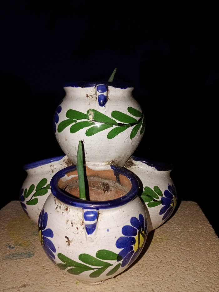 Three white, ceramic pots with painted blue and green designs are stacked on a tan, textured surface. A dark background obscures the surrounding environment. The pots have handles, and each contains soil with a single green shoot emerging. The pots appear slightly dirty or worn, with minor imperfections in the paint and surface. They are arranged such that one pot sits atop two others.