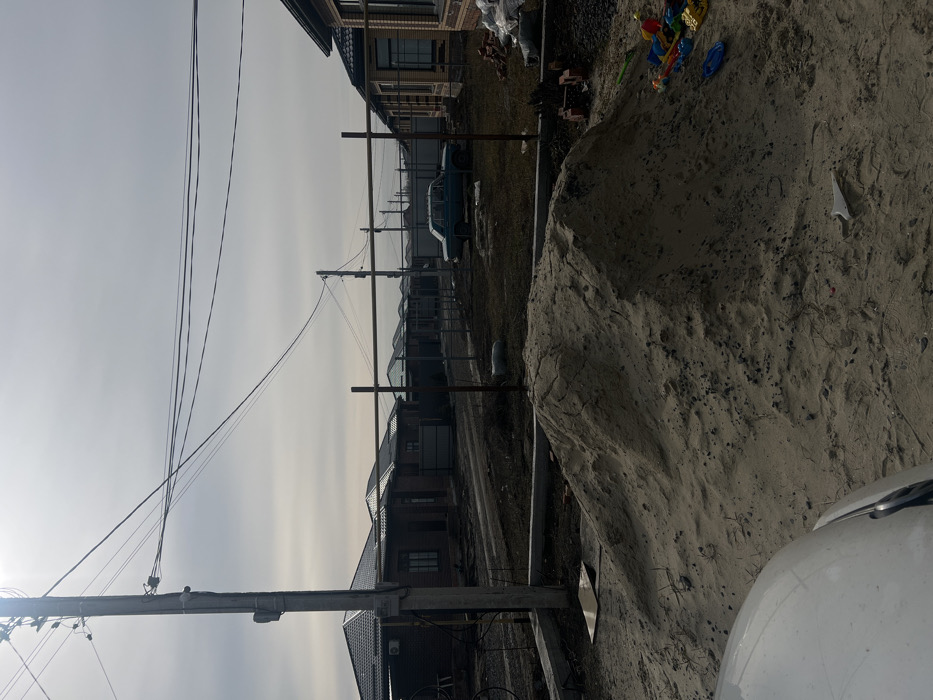 The image depicts a residential scene in Leninakan, Russia, under an overcast sky. In the immediate foreground, the front portion of a white vehicle's hood is visible on the lower left. Directly ahead, a substantial pile of light-colored sand and dark gravel dominates the lower center. To the right of the sand pile, several brightly colored children's toys, including buckets and shovels, are scattered on the ground. To the left, a single square white tile rests on dark soil. Beyond the immediate foreground, a perimeter is marked by a nascent metal fence constructed of vertical posts and horizontal bars. Within this fenced area, a sparse patch of dry grass and dirt is visible. A light blue sedan, consistent with a Lada Zhiguli model, is parked facing right in the midground field. To its left, a white bag or similar object lies on the ground. A dirt road or path extends horizontally across the scene, separating the foreground from the background structures. The background consists of a row of newly constructed or recently completed single-story houses, primarily made of brick with dark-tiled gable roofs. Some houses feature multiple windows, and one on the far left exhibits an external air conditioning unit. Multiple utility poles with a dense network of overhead power lines extend across the frame and into the distant horizon. The sky is uniformly overcast, with a bright diffuse light source centered above the left utility pole. No individuals are present in the scene, and no overt actions or interactions are depicted.