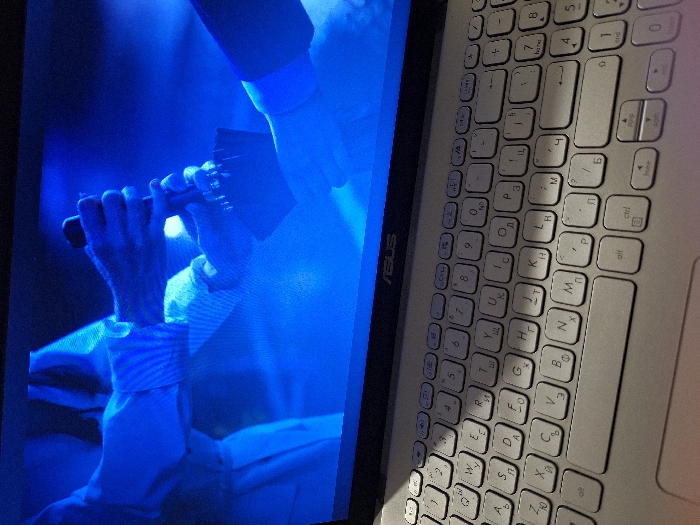 This image captures a close-up, high-angle view of a gray ASUS laptop, likely located in an unspecified indoor environment within the city of Unknown, Unknown. The laptop is open, displaying an active scene on its screen under a predominant blue light. The screen content depicts a dramatic, blue-hued scene. On the left, a pair of hands wearing light-colored, possibly white, long-sleeved garments holds a dark, elongated, cylindrical object vertically. To the center-right, another pair of hands, also with light-colored sleeves, grasps a dark, rectangular object horizontally, possibly a book or tablet. A third hand, partially visible on the far right with a darker sleeve, appears to be interacting with or receiving the rectangular object. The background of the screen content is dark and illuminated with intense blue light, suggesting an indoor setting such as a stage or ceremonial space. Below the screen, the laptop's keyboard is visible, featuring a silver-gray finish with keys displaying both Latin and Cyrillic characters, indicative of a Russian or Ukrainian layout. The trackpad and a portion of the palm rest are visible at the bottom of the frame. The laptop's "ASUS" logo is centered above the keyboard.