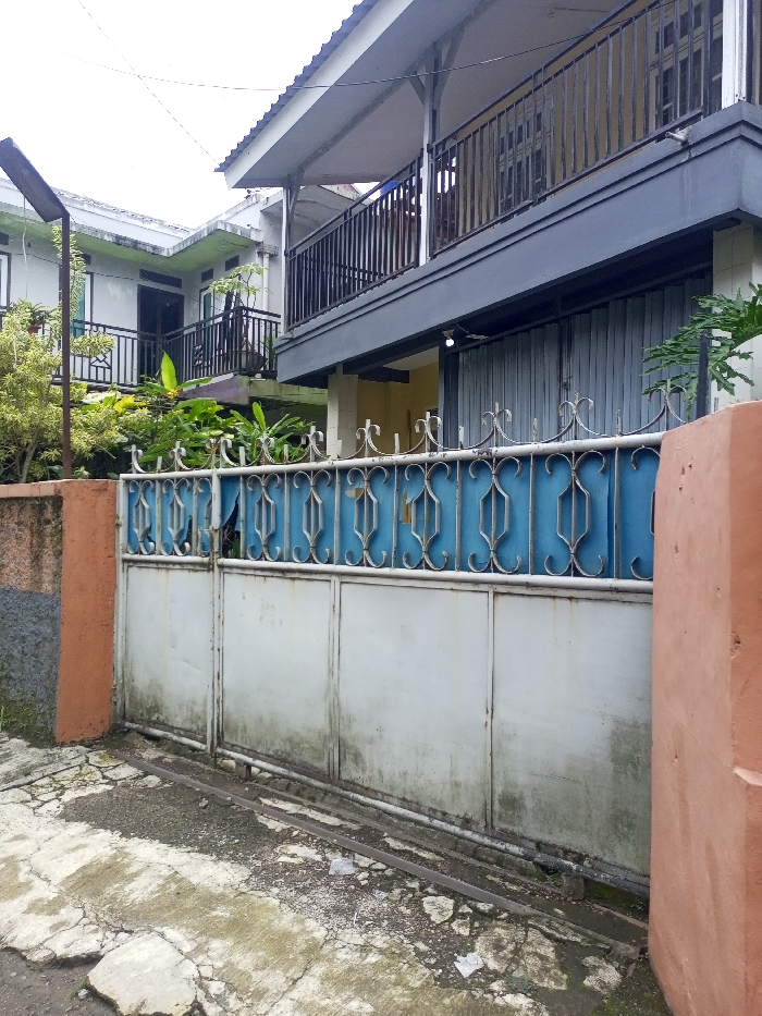 The image displays an exterior residential scene in Meyong, India, under an overcast sky. In the foreground, a cracked concrete pavement with scattered debris and a metal gate track leads to a two-panel sliding metal gate. The gate's lower sections are solid, discolored white, exhibiting greenish staining, while the upper sections consist of light blue panels featuring white decorative wrought iron scrollwork. A tear is visible in the blue panel of the left gate section. The gate is positioned between two reddish-brown concrete pillars; the left pillar also has a lower section of grey, textured material. Behind the gate, two multi-story houses are visible. The structure on the right features a dark grey-fronted first-floor balcony with a black metal railing and a white corrugated roof supported by white posts. Below this, a light-colored wall is partially visible, along with a closed, light-colored accordion-style or roller shutter door/window, above which a small white exterior light fixture is mounted. The house to the left is set back further, displaying white walls and a black metal balcony railing on its upper level. Dense green foliage, including broad-leafed plants and shrubs, is present around and between the two residences. The sky is uniformly light grey and overcast. No individuals or active interactions are depicted. Overhead utility wires crisscross the sky.