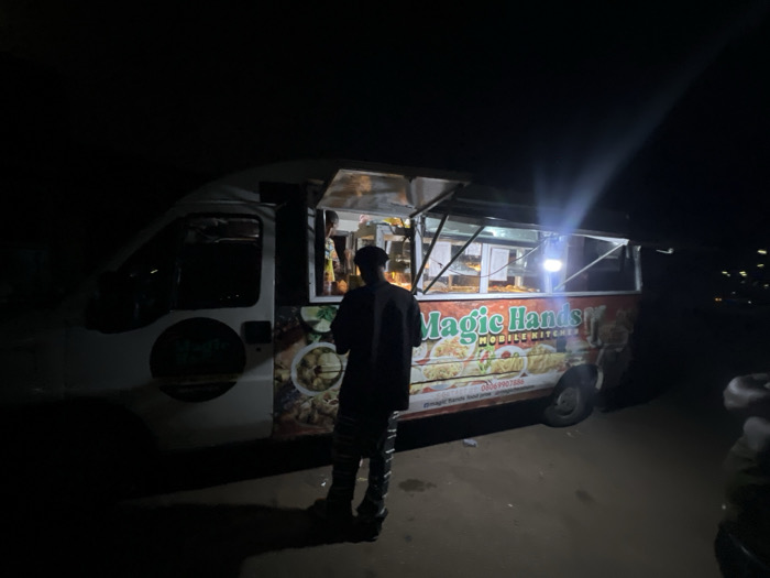 At night, a food truck named "Magic Hands Mobile Kitchen" stands illuminated