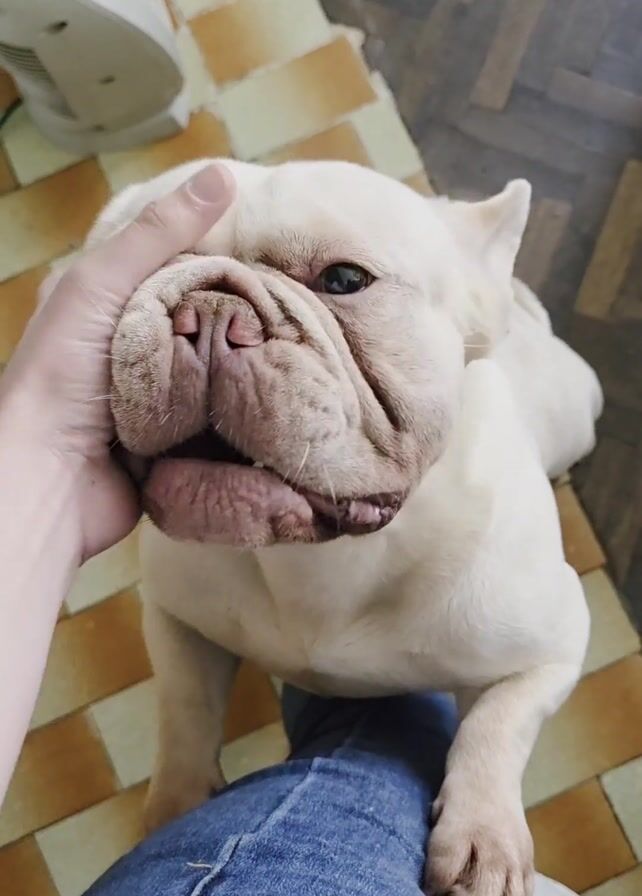 - "A high-angle shot shows a pale French bulldog being petted" by FM-moJH62, licensed under CC BY 4.0