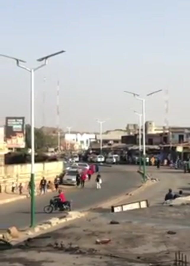 street scene in a city or town, likely in Africa given the style of buildings, infrastructure, and the people