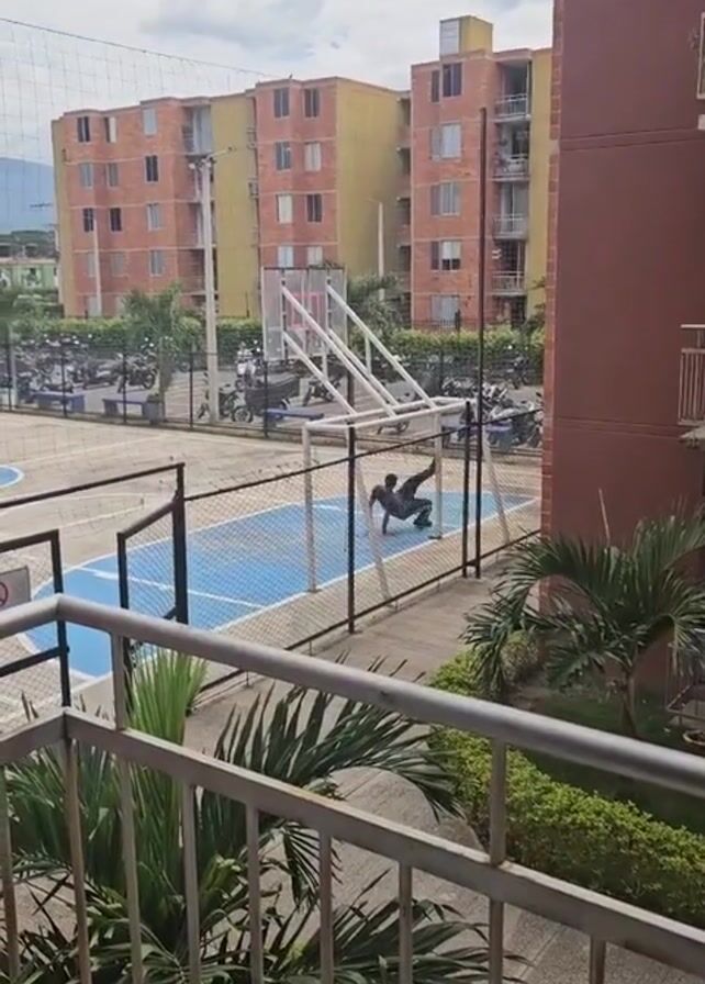 n outdoor basketball court in front of an apartment building, taken from a balcony. A man is seen initially crouched down on the court and then walks away. The court is blue and white, enclosed by a fence and netting. There are parked motorcycles beyond the court and apartment buildings in the background. Plants are visible on the balcony railing. A "no smoking" sign is attached to the fence.
