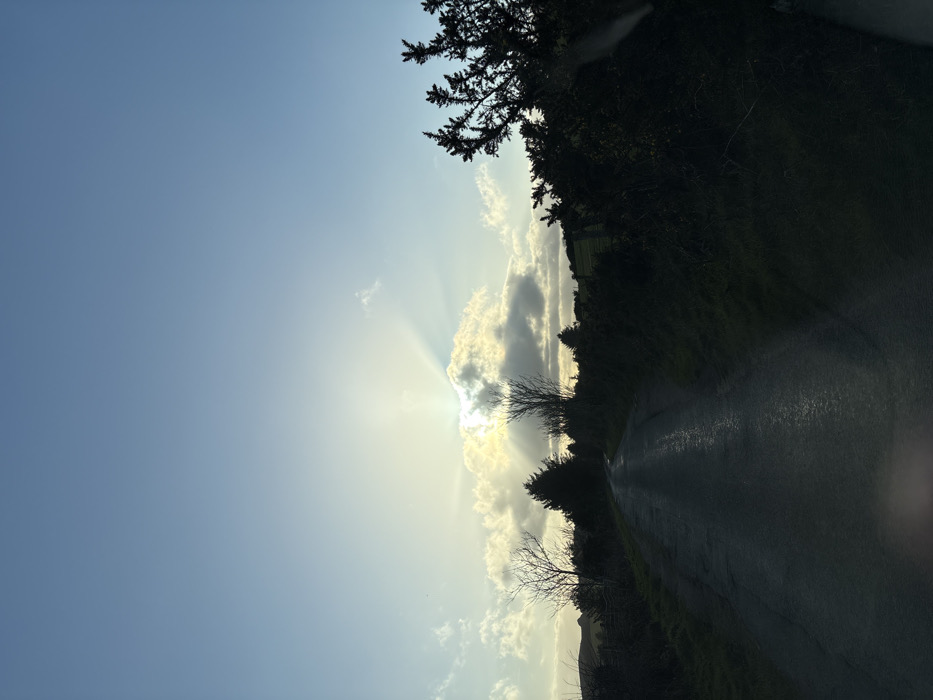 The image displays a rural landscape near Shrewsbury, United Kingdom, characterized by a narrow, wet, dark asphalt road that recedes into the middle distance, curving gently to the left. The road reflects ambient light. The upper two-thirds of the scene feature a light blue sky with scattered clouds. The sun, partially obscured by a prominent cloud formation, is positioned in the upper-middle-left quadrant, emitting strong crepuscular rays that fan upwards. Dense vegetation borders both sides of the road. On the left, bare deciduous trees and an evergreen conifer are visible on a grassy embankment, with distant rolling hills on the horizon. On the right, dark, dense bushes and shrubs line the roadside, partially obscuring a field behind them. The scene is backlit, rendering much of the foreground and midground vegetation in silhouette. No individuals, vehicles, or specific actions are discernible.