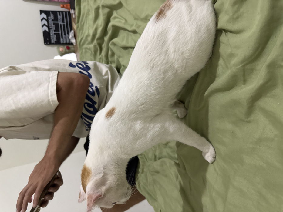 The scene depicts an indoor environment, likely a residential space, located in Cam Đức, Vietnam. A short-haired white cat with distinct ginger patches on its head, mid-back, and hindquarters is positioned on a wrinkled pale green fabric, indicative of a bed sheet or blanket. The cat is in a crouching or partially standing posture, facing towards the left side of the frame with its head turned slightly in the same direction, appearing alert. Behind and to the right of the cat, a person is seated on the identical green fabric. This individual, identifiable by visible arms and hands, wears a light-colored short-sleeved t-shirt featuring partial blue lettering. The person's hands are actively engaged with a smartphone, holding it horizontally with a light brown or gold-colored case. In the background, on a surface to the right, a black clapperboard with "UNIVERSAL STUDIOS" prominently displayed at the top stands upright, flanked by small decorative items against a plain light-colored wall.
