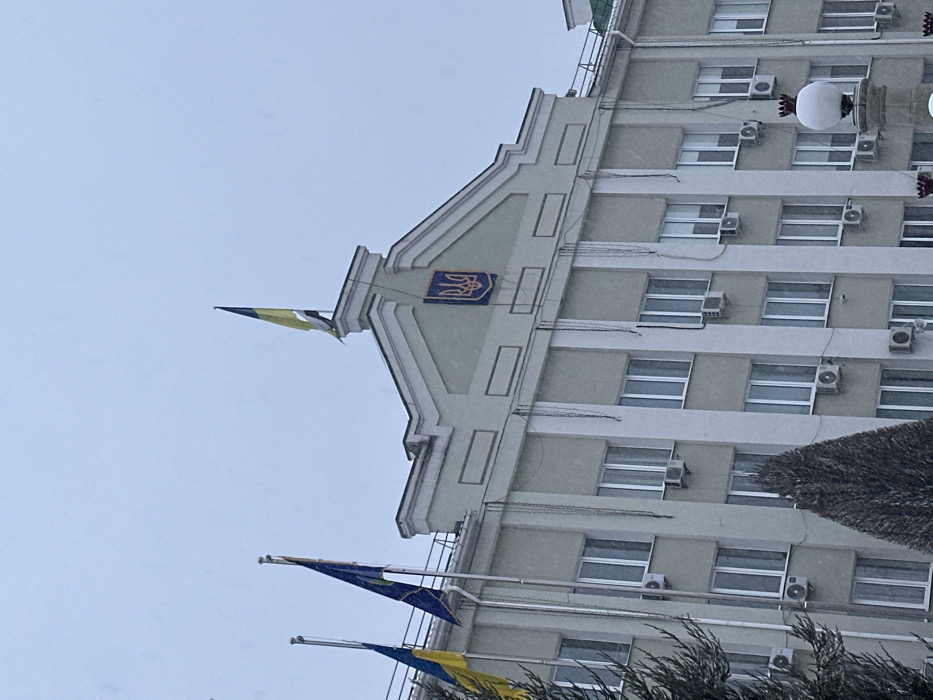 A building with multiple stories is shown from a low angle against a cloudy sky. The building is light grey or beige, with rows of windows and air conditioning units. The roofline has a distinctive peak with the Ukrainian coat of arms. Ukrainian flags are mounted on poles and flying in the wind. The image is somewhat tilted to the right.