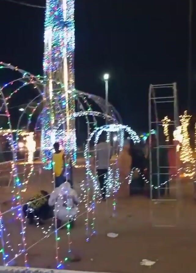 At night, a public square is illuminated with colorful holiday lights. A tall structure covered in shimmering lights dominates the background. People stroll around, some standing and conversing. Several arched light structures, covered in multi-colored lights, line the foreground. One person crouches low to the ground, near one of the arches. The video is taken from under an overpass or similar structure.