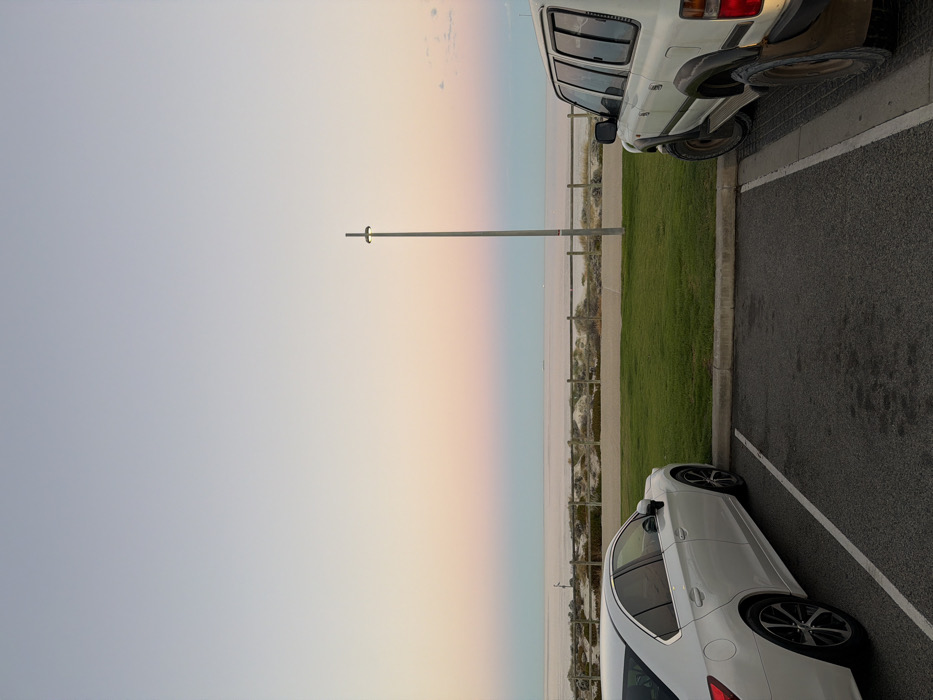 The image displays a coastal scene at dusk or dawn in Scarborough, Australia. The foreground shows an asphalt parking lot with white painted lines. A white sedan is parked on the left, facing away, occupying one bay. To its right, the rear passenger side of a white, older model SUV, dirty around the wheels, is partially visible in an adjacent bay, also facing away. Beyond the parking lot, a concrete curb separates it from a strip of green grass. A tall, slender grey street light pole with a single illuminated fixture stands centered in the grass. Further back, a sandy dune area with sparse vegetation is contained by a low fence made of wooden posts and horizontal rails. The ocean stretches horizontally behind the dunes, appearing calm. Several faint, indistinct objects are visible on the distant water surface. The sky above presents a gradient, transitioning from light blue at the top to soft pink and orange hues near the horizon. No individuals are present, and no actions or interactions are depicted.