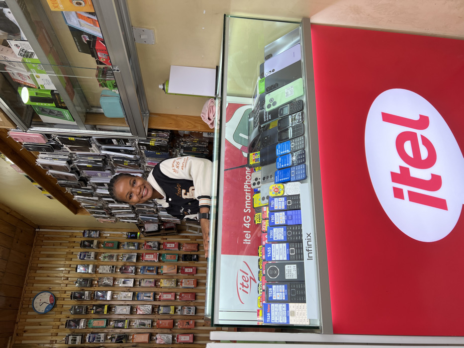 The image depicts the interior of a mobile phone retail establishment in Arusha, Tanzania