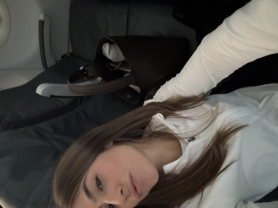A woman with long brown hair lies on a black airplane seat, wearing a white shirt