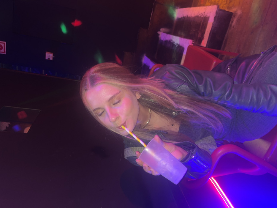 A young female, with long blonde hair illuminated by pink and purple light, is depicted in a dimly lit nightclub environment