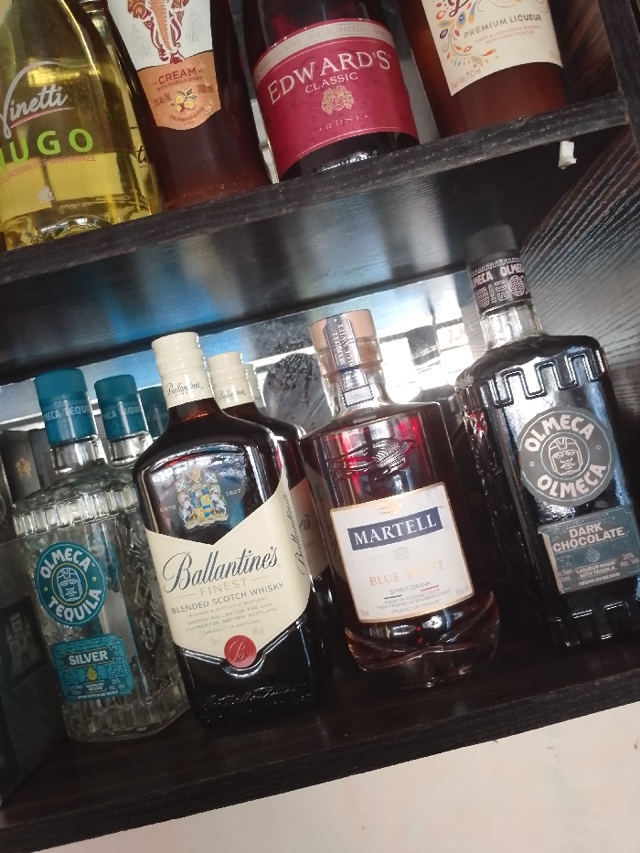 A slightly tilted image captures a close-up view of two dark-colored wooden shelves displaying various bottled alcoholic beverages, located in the city of Unknown, Nigeria. On the upper shelf, partially visible from left to right, are: * A clear bottle of Vinetti Hugo with yellow liquid. * A bottle of cream liqueur with a brown liquid and an elephant illustration on its label. * A dark red bottle labeled "EDWARD'S CLASSIC ROSE." * A tall clear bottle of a "PREMIUM LIQUEUR" with a floral design on its label. On the lower shelf, arranged from left to right, are: * A clear bottle of Olmeca Tequila Silver with a blue cap and embossed branding, with parts of two similar bottles visible behind it. * A dark bottle of Ballantine's Finest Blended Scotch Whisky with an off-white label. * A clear bottle containing brown liquid, identified as Martell Blue Swift Spirit Drink, featuring a textured neck. * A dark brown, textured bottle of Olmeca Dark Chocolate liqueur. No individuals are present in the scene. The background behind the lower shelf suggests an open space or light source.