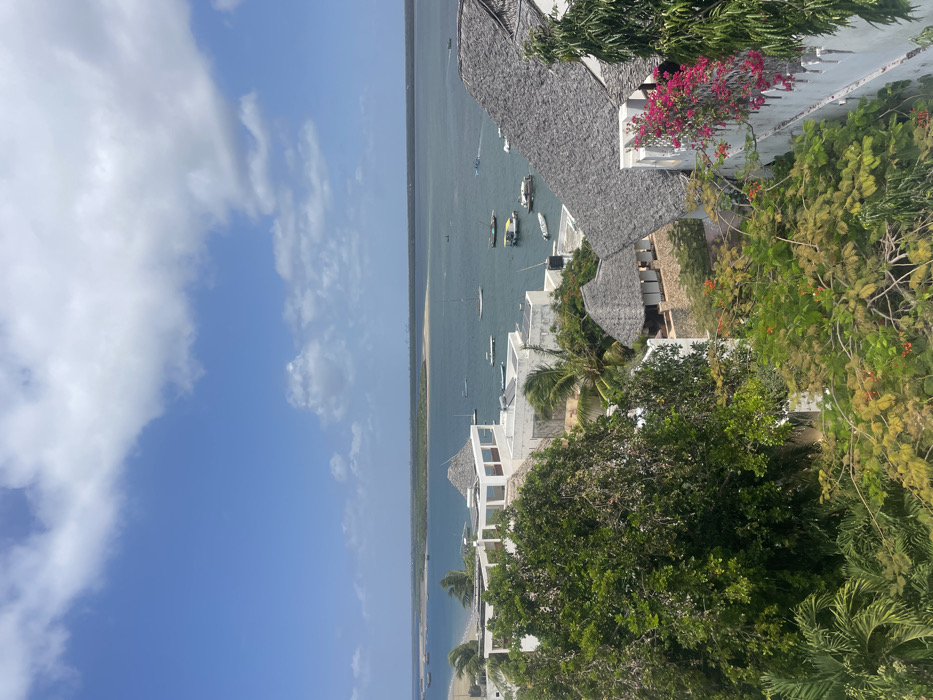The image depicts an aerial-perspective view of Shella ward, Kenya, showcasing a coastal settlement and a body of water under a partly cloudy blue sky. The scene is dominated by a wide, calm expanse of blue-green water, likely an ocean bay or channel, extending across the midground to the horizon. A distant, low-lying landmass with sandy shores and dense green vegetation is visible across the water. Numerous boats are present on the water, including several traditional wooden dhows, smaller white recreational or fishing boats, and one distinct yellow-and-green vessel with a canopy, suggesting a passenger or tour boat. Most boats appear to be anchored or moored. In the foreground and midground, a cluster of white-washed buildings with distinctive architectural styles is interspersed among lush green tropical vegetation. Many roofs are steeply pitched and covered with dark thatch or tiles, while others are flat terraces. Solar panels are visible on some rooftops. Specific architectural features include white walls, some with crenellated tops, and balconies. A vibrant pink bougainvillea plant cascades over a white wall in the lower right foreground. Large, mature green trees and various shrubs occupy the lower left and central foreground, with palm trees also visible. No people are discernible in the frame. The lighting suggests a bright, sunny day.