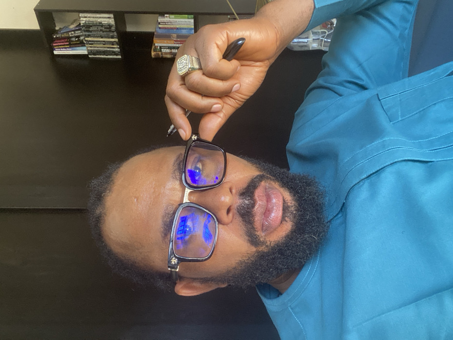 A medium close-up image depicts a dark-skinned adult male in an indoor setting. He has a full beard and mustache, with dark, curly hair receding at the temples. His eyes are visible through rectangular-framed glasses with dark rims and gold-colored accents on the sides, which reflect blue light. He is wearing a teal-colored, collared garment with a V-neck opening and subtle vertical stitching details on the front. His right hand is raised, holding the right temple of his glasses with his thumb and index finger, while also holding a black pen between his index and middle fingers. A prominent, gold-colored ring with multiple clear stones is visible on the ring finger of his right hand. His lips are slightly parted. The background is predominantly dark and out of focus, with a bookshelf containing various books and CDs or DVDs visible in the upper right quadrant. The specific location in the city of Jos, Nigeria, is not discernible from the image.