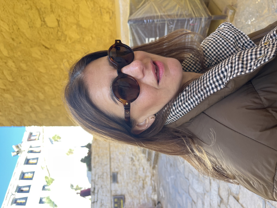 A medium close-up shot features a woman in an outdoor setting within Chengguan District, Lhasa, China. The woman, positioned in the foreground and mid-frame, faces slightly towards the viewer's left with a subtle smile and parted lips. She has medium-brown hair with visible graying at the part and wears round, dark-lensed tortoiseshell sunglasses accented with small gold-colored diamond shapes on the temples. A small gold-colored hoop earring is visible in her left ear. She is dressed in a dark brown puffer jacket, the collar of which reveals a black and white gingham pattern. The background on the left reveals a large, multi-story white building with numerous rectangular windows, consistent with the architectural style of the Potala Palace. Below this structure, a light-colored stone pathway or wall is visible, upon which two distant figures are present; one is discernible in a dark red robe. The right side of the background is dominated by a textured, ochre-yellow wall. Partially visible in the lower right corner, adjacent to the yellow wall, are indistinct objects wrapped in clear plastic sheeting. The scene is illuminated by bright daylight under a clear blue sky, and the ground in the mid-ground appears to be paved with uneven flagstones.