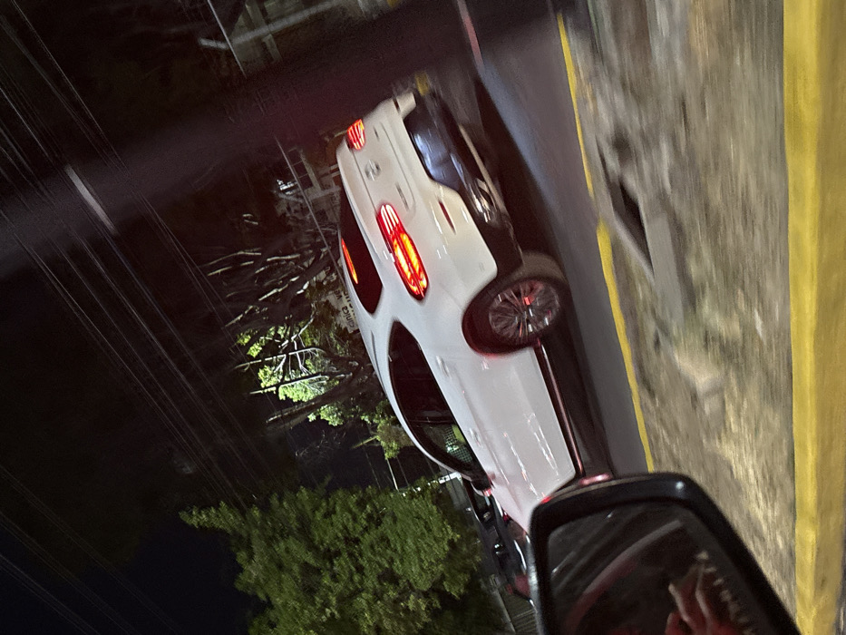 A white car parked on the side of a road at night, illuminated by streetlights. The car's taillights are visible. The road has a yellow curb. A side mirror of another vehicle is partially visible in the foreground, reflecting the scene. Trees and bushes are present in the background, contributing to the overall nighttime setting. Utility wires are also visible overhead.