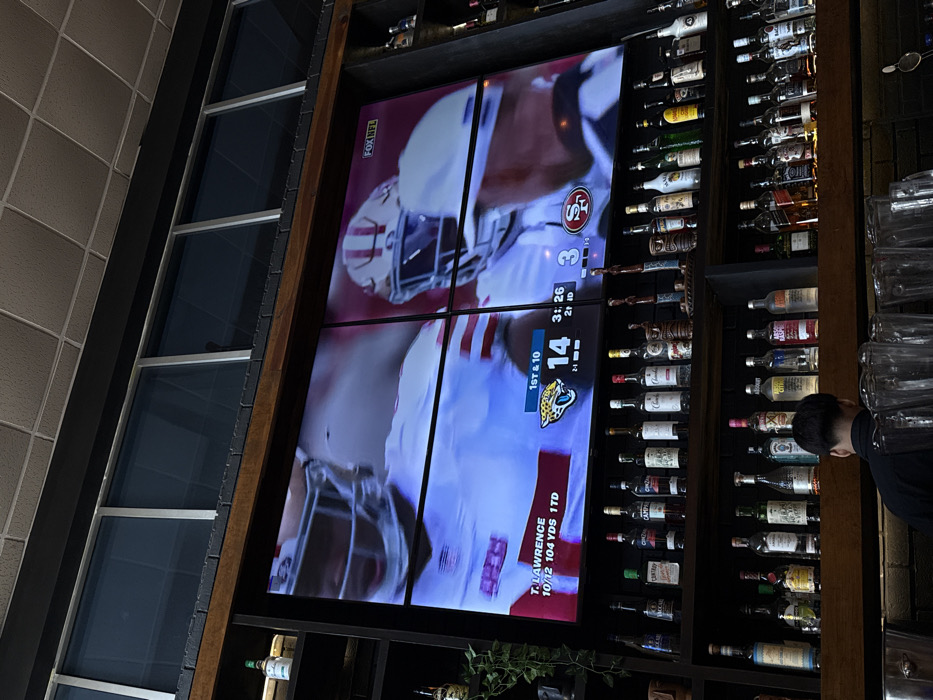 This image depicts the interior of a bar in Monterrey, Mexico, viewed from a low angle looking upwards. The central feature is a large video wall, composed of four display screens, showing an American football game. The game features the Jacksonville Jaguars (score 14) against the San Francisco 49ers (score 3), with 3:26 left in the second quarter and a "1st & 10" down. Statistics for "T. Lawrence" (10/12, 104 YDS, 1 TD) are displayed on the lower-left screen. The broadcast is identified by the "FOX NFL" logo. Below the video wall, a dark wooden bar counter extends across the frame. A bartender is partially visible from behind, facing away from the camera, attending to the bar. His short, dark hair is visible, along with the back of his dark shirt. Several clear glasses are stacked on the counter in front of him. Behind the bar, dark wooden shelving units hold an extensive collection of various liquor bottles, including whiskeys, vodkas, tequilas, and liqueurs, arranged in multiple rows. A small green potted plant is visible on one shelf, and several decorative tiki-style mugs or carvings are placed on the top shelf. The upper portion of the scene reveals high-set, rectangular windows with dark panes, framed by a dark beam and exposed dark brickwork, suggesting an external view or internal division. The ceiling above these windows is a light-colored, acoustic tile grid.