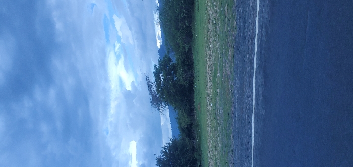 The landscape features a dark road with a white line dividing it from a grassy area. Beyond the grass, trees and shrubbery are visible against a backdrop of distant hills. The sky is filled with textured, cloudy formations in shades of blue and gray. The image is taken with the camera oriented vertically.