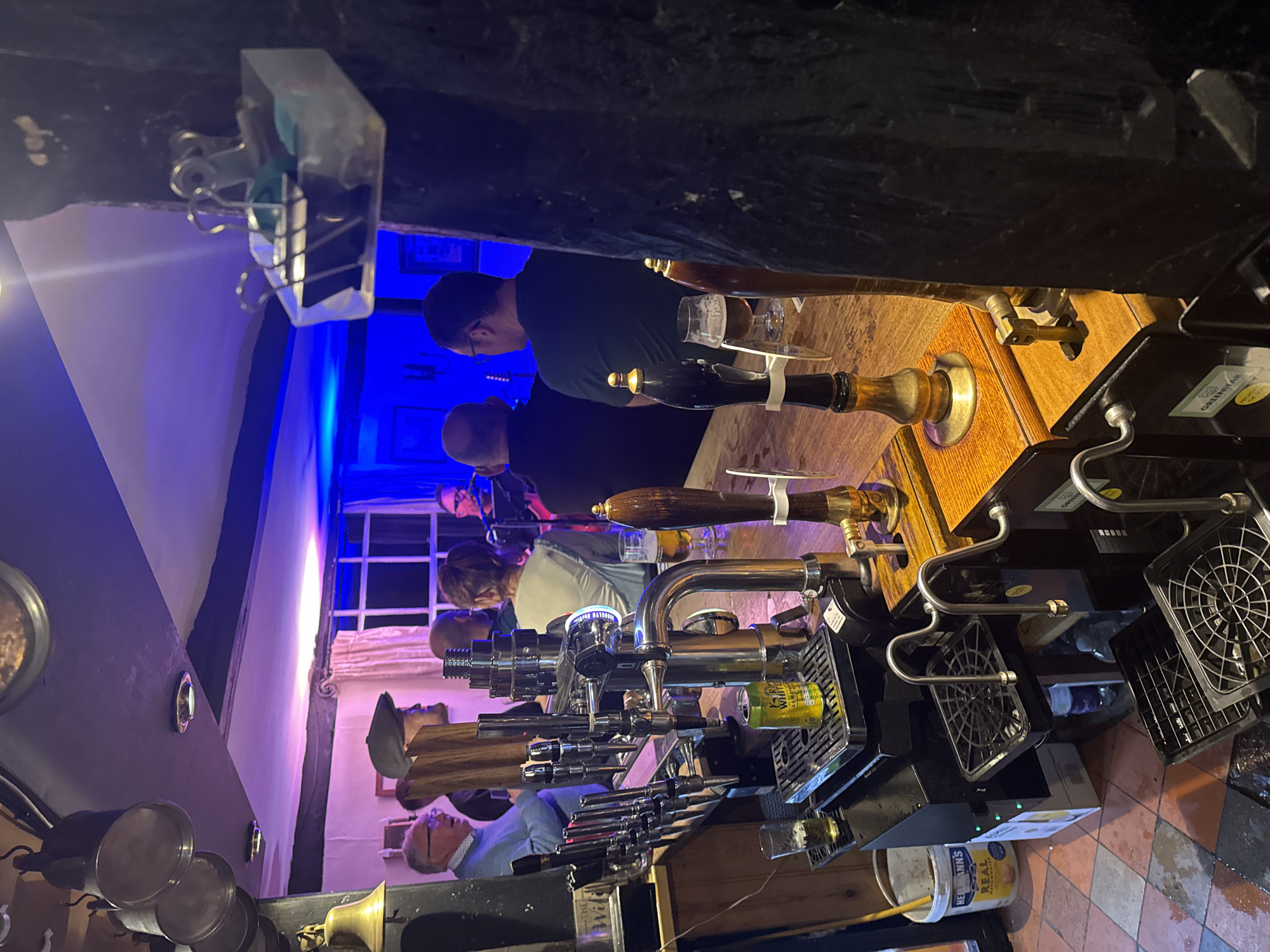 inside of a pub in Babergh, United Kingdom, specifically behind the bar. Five people stand at the bar, appearing to be customers. A series of beer taps are visible along the bar top, with glass holders underneath. In the background, there is a window with multiple panes. The lighting is a mixture of blue and violet. A bucket labeled "HELLMANN'S REAL" is visible on the floor behind the bar. The floor is tiled with an alternating pattern of light and dark squares.