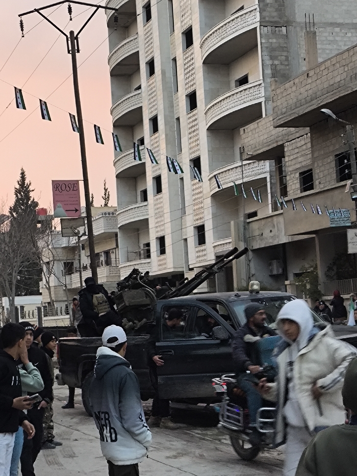This image depicts a street scene in Jirud, Syria, at what appears to be either dawn or dusk, characterized by a light pink-orange sky. In the center of the frame, a dark-colored pickup truck is positioned on an unpaved street. Mounted in the truck bed is a prominent twin-barrel anti-aircraft gun, likely a ZPU-2. An individual dressed in black tactical gear, including a vest and helmet, is visible standing or kneeling behind this weapon. At least two other individuals are visible within the truck's cab. One person, wearing a dark jacket and cap, leans out of the driver's side door. To the right of the truck, a man on a motorcycle, also wearing a dark jacket and cap, is actively moving forward, carrying a blue object (possibly a container) on his vehicle. An individual in a white hoodie is partially visible in the right foreground, in motion. On the left side of the street, a group of primarily male civilians stands, some observing the scene. One individual in a white cap and a grey/white hoodie with text on the back stands facing away from the viewer. The background features multiple urban buildings. A tall, light-colored multi-story building with numerous curved balconies and dark window openings dominates the left-center. To its right, another building constructed from concrete blocks is visible. Numerous small, rectangular flags, consistent with the Syrian opposition flag (green, white, black stripes with three red stars), are strung horizontally across the street, attached to utility lines and draped from balconies. A tall utility pole with cross-arms and insulators stands prominently on the left side of the frame, supporting multiple overhead wires. A pink rectangular sign displaying "ROSE" in English and Arabic script, with a directional arrow, is visible on a lower building to the left. The street surface appears uneven, indicating an active or worn urban environment.