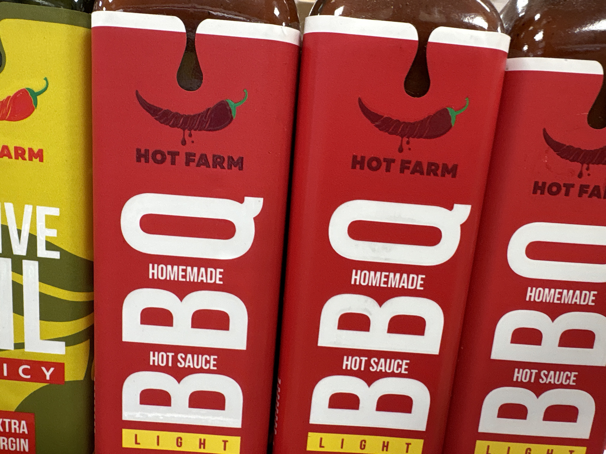 close-up of several bottles of "Hot Farm" brand BBQ hot sauce and olive oil