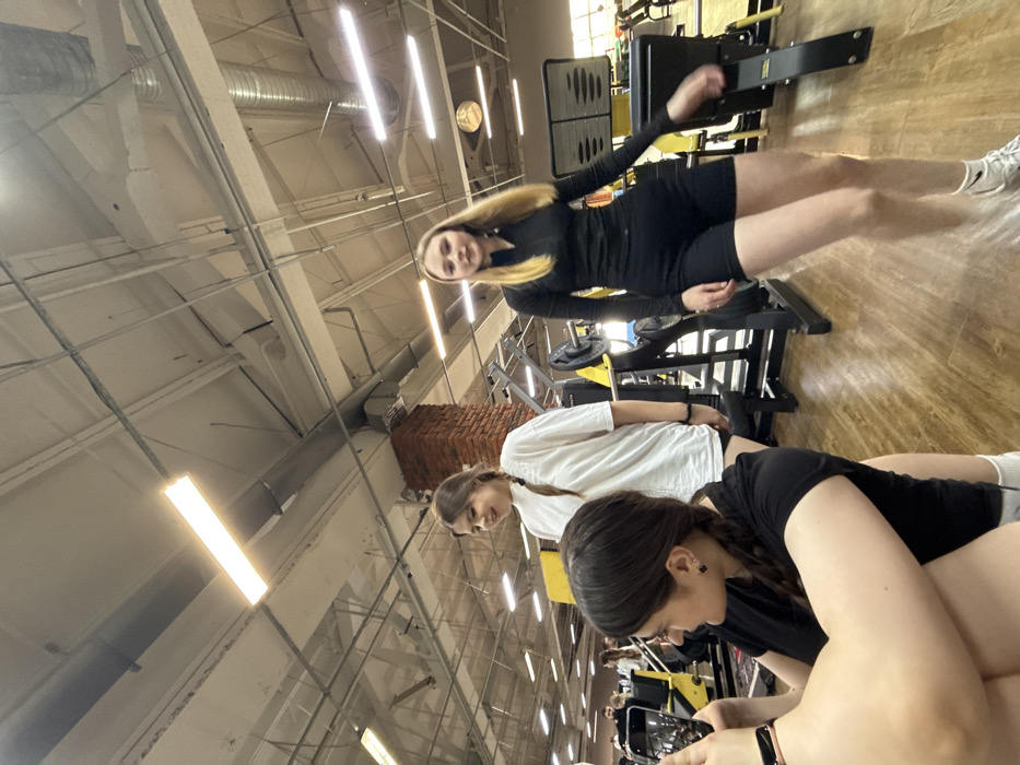 An indoor scene depicts a gymnasium in Chaikovsky, Russia. The high ceiling features exposed white metal beams, light-colored panels, and rectangular fluorescent light fixtures. Silver-colored air ducts are visible across the ceiling. A brick support pillar is located in the mid-left background. The floor is covered with a wood-patterned material. Various pieces of gym equipment, characterized by yellow and black components, are situated throughout the facility. In the foreground, a female with dark brown hair styled in a braid is seated or crouched, facing right in profile. She wears a black short-sleeved top and black stud earrings. Her right hand holds a black smartphone with a silver/rose gold frame, pointed outward. A rose gold-colored fitness tracker is on her left wrist. To her right and slightly behind, a second female with brown hair in a single long braid stands, oriented towards the right, displaying a slight smile. She wears an oversized white t-shirt and black shorts, with a black bracelet on her left wrist. Further to the right and also standing, a third female with long blonde hair faces forward. She is attired in a black long-sleeved athletic top with a partial zip, black athletic shorts, and white sneakers with a black Nike logo. Her lower body exhibits slight motion blur. Several other individuals are partially visible in the distant background, utilizing gym equipment.