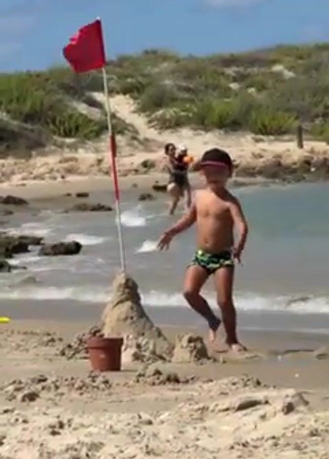 On a sunny beach, a child in a swimsuit and cap stands near a sandcastle with a red flag. Another child runs past him. In the background, two adults are in the water. The sky is blue with a few clouds, and vegetation is visible on the dunes behind the beach.