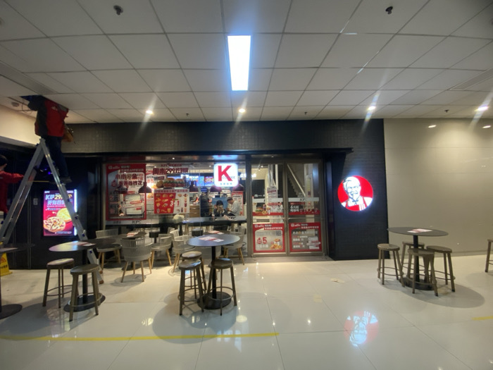exterior of a KFC fast food restaurant located in Qingdao, China at the coordinates latitude: 35.987, longitude: 120.152. The restaurant has a large glass storefront with red and white signage and a large KFC logo. The storefront displays a large variety of menu items. The scene is captured from an interior perspective, looking out toward the entrance. Tables and chairs are positioned along the wall, with a few tables positioned further out. A lone worker is climbing a ladder and appears to be installing a sign above the entrance. The environment is clean, well-lit, and modern, with a white tile floor and a white ceiling. The lights are on, and the storefront appears to be open for business.