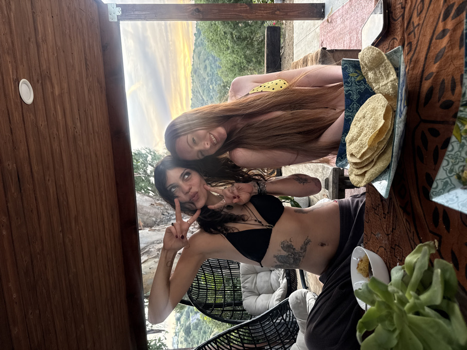 The image displays two adult females on an outdoor patio overlooking a hilly, vegetated landscape under a sunset sky, consistent with locations within or near the hills of Los Angeles, California, USA. The female on the left has dark hair, wears a black bikini top and dark pants, and exhibits tattoos on her left ribcage and left upper arm. She is making peace signs with both hands, one near her face and the other near her chest, while smiling. A lip piercing is visible, and her fingernails are painted dark red. Behind her, a rattan-style hanging egg chair with light-colored cushions is visible. The female on the right has long reddish-brown hair and wears a yellow polka-dot bikini top. She is smiling directly at the camera. In the foreground, a wooden table is covered with a patterned, reddish-brown fabric. On the table are a white bowl containing a yellow food substance and a spoon, a blue-patterned square plate holding a stack of flatbreads or chips, and a plant with fleshy green leaves. A smartphone is partially visible on the table to the right. The patio features a wooden beamed ceiling with a recessed light fixture. The background shows rolling hills covered with dense vegetation under a sky with orange, yellow, and blue hues from the setting sun.