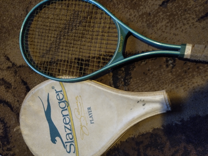 - "The image displays a teal-colored tennis racket and an off-white tennis racket cover, both bearing the "Slazenger" brand, resting on a dark patterned surface" by FM-9dzTh2, licensed under CC BY 4.0