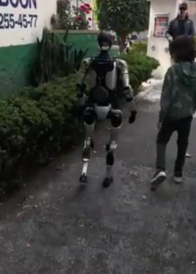 humanoid robot walking along a sidewalk, followed by a young boy and a man in the background