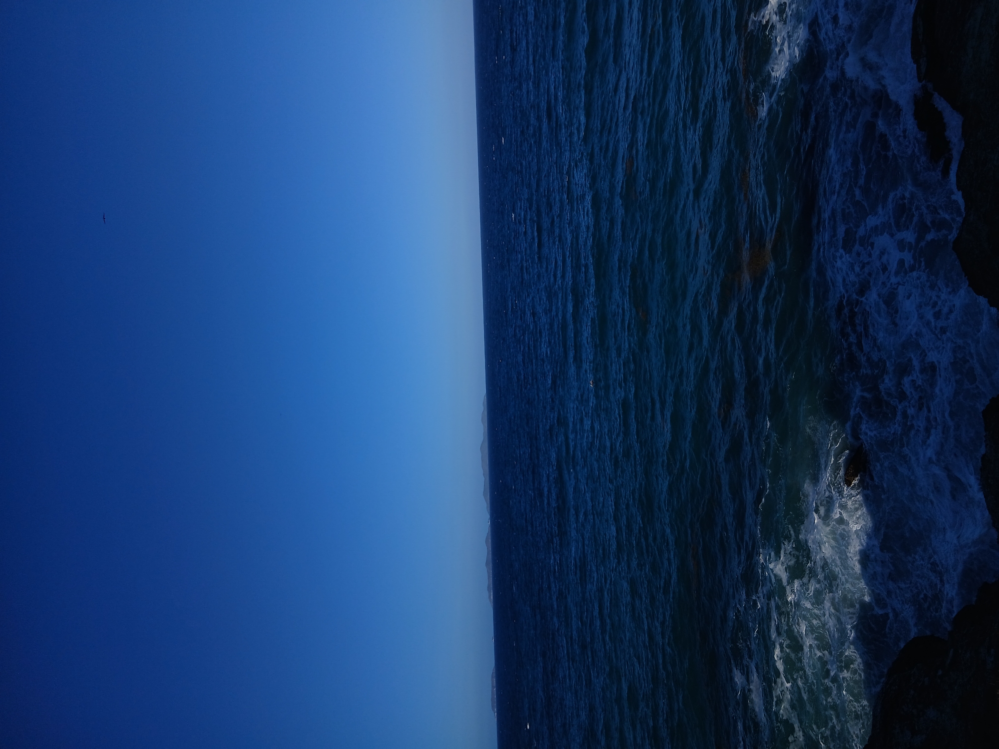 The image depicts a coastline scene, with the sky on the left and the ocean on the right. The sky is a clear, gradient blue, transitioning from a darker hue at the top to a lighter one towards the horizon. A small bird can be seen flying in the upper left quadrant of the sky. The ocean is a deep blue with whitecaps and waves crashing against the rocky shore on the right side. The shoreline is dark, suggesting rocks or cliffs. The location is likely Playa Parguito, Venezuela, though specific identifying features confirming this are not visible in the image. No people are visible.
