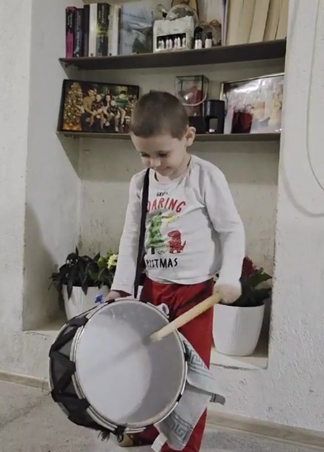 A young boy, approximately 4 years old, stands indoors and plays a drum