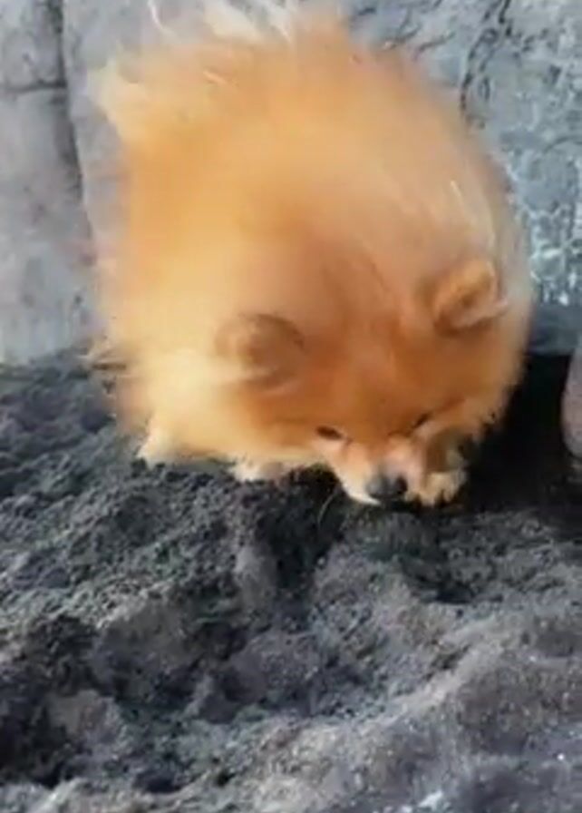 A small, tan, fluffy Pomeranian dog stands on black sand, having dropped a small, green, knobby toy from its mouth. The dog looks down at the toy, sniffs it, then looks up and barks. The background includes a rock formation.