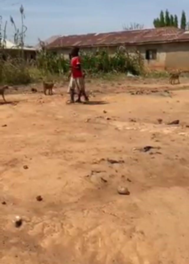 In a medium shot, two children stand on a brown dirt road, encircled by several dogs. One child, wearing a red shirt and light-colored skirt, holds a stick. The second child wears a light-colored dress. The dogs, varying in size and color, are scattered around them, some moving and others stationary. In the background, simple, single-story buildings with corrugated metal roofs and faded paint can be seen, interspersed with patches of green vegetation. Power lines stretch across the clear blue sky. The overall scene suggests a rural setting, with the children and animals interacting in a communal space.