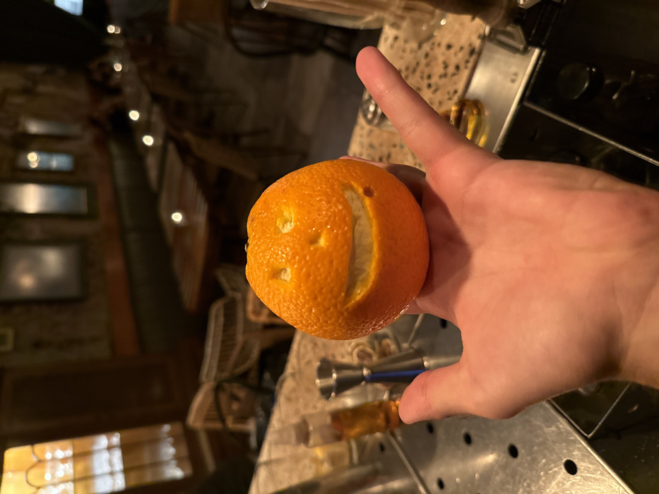 A hand holds an orange with a carved face, resembling a jack-o'-lantern. The orange peel has two small, carved circles for eyes and a wider, curved slice to form a smiling mouth. The orange is positioned over a stainless steel surface with bar equipment, possibly in a bar or restaurant setting. The background shows blurred tables and chairs, suggesting an interior space. The lighting is soft and warm.