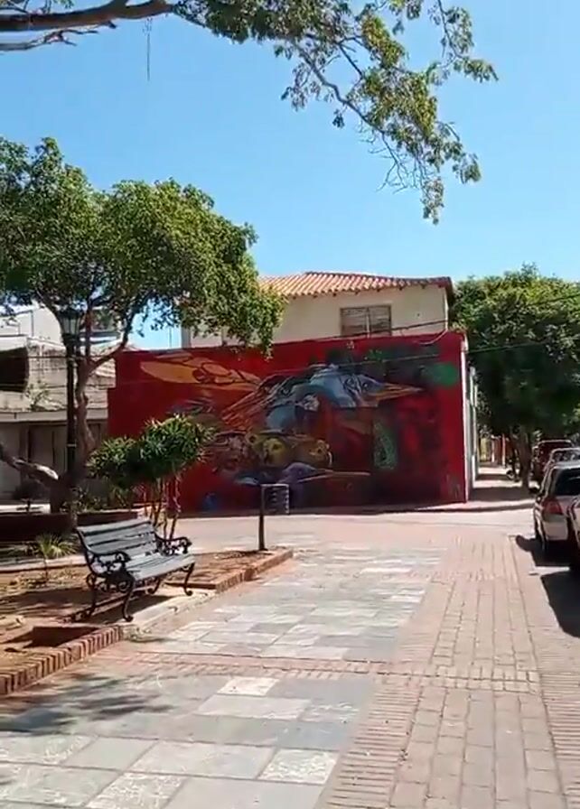 sunny street scene during the day. A sidewalk of patterned bricks and tiles is visible. A black bench sits in the foreground, near a short, dark green bush and a black light post. Behind the bench and sidewalk is a bright red wall with a mural. The mural features a diverse range of birds and a depiction of a person. Trees frame the shot on either side. A building with a tiled roof and a window is visible above the red wall. Several cars are parked down the street on the right side.