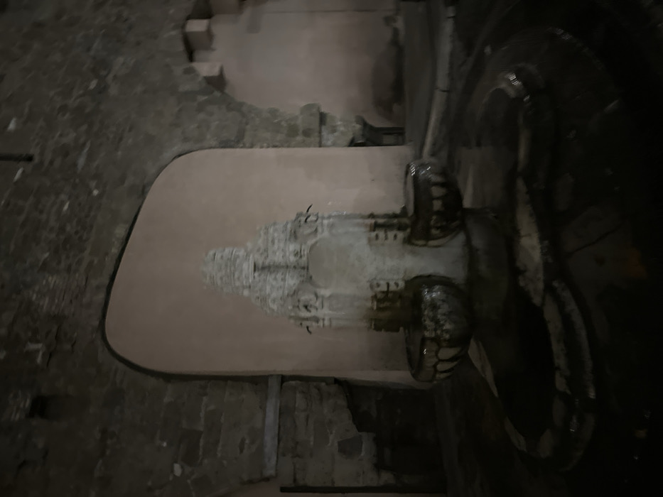 An interior shot reveals an ancient stone structure, possibly a temple. A prominent, weathered, white stone sculpture or artifact sits atop a raised platform with a smooth, light pink surface. The sculpture appears detailed with intricate carvings. The surrounding walls are constructed from aged stone, with evidence of wear and potential erosion. A dark, circular feature, possibly a pool or well, is adjacent to the platform, shrouded in shadow. The overall atmosphere evokes antiquity and mystery.