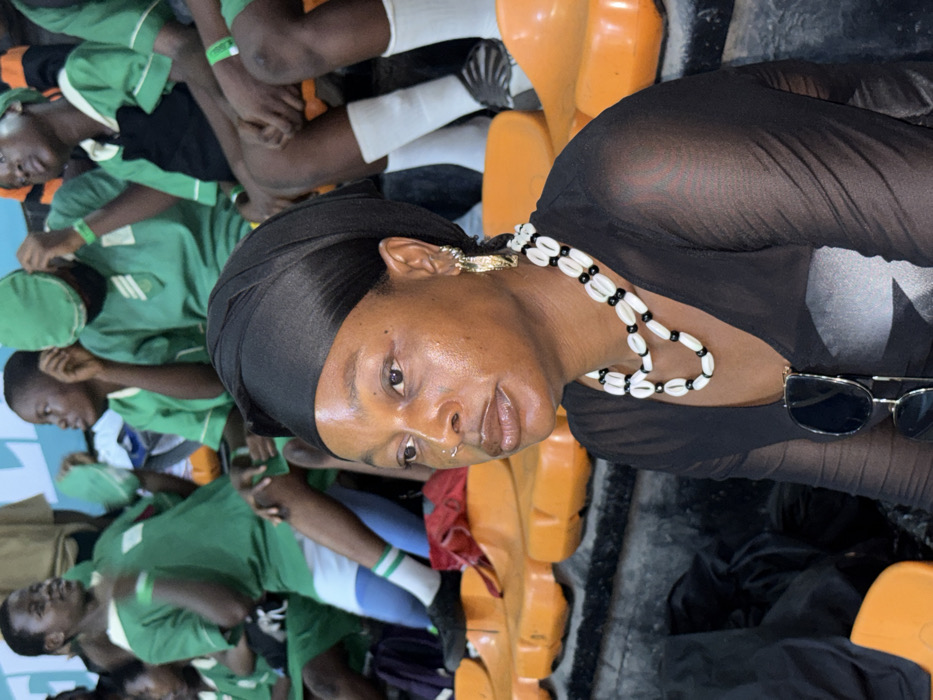 The image displays a scene within an outdoor or semi-outdoor venue, identified as being in Iganmu, Nigeria. In the foreground, an adult Black female is seated, her torso angled slightly right, while her head is turned to face left, her gaze directed off-camera. She wears a black satin headwrap, a sheer black long-sleeved top, and a two-strand necklace constructed from white cowrie shells interspersed with black beads. A pair of dark-lensed sunglasses hangs from the neckline of her top. She exhibits a nose ring on her left nostril and large gold-toned hoop earrings. In the midground and background, multiple individuals, predominantly adolescents, are seated on elevated rows of bright orange plastic stadium seats. Most of these individuals are clad in green short-sleeved uniform shirts, some featuring white trim or emblems. Several wear bright green wristbands. One person on the far left wears blue and white striped socks, and another wears a green cap. A light blue wall or panel with white lettering is visible in the distant background.